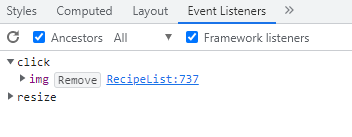 브라우저에서 Event Listeners를 확인해보니 click 이벤트가 안 걸려 있었다.