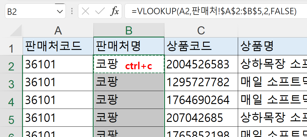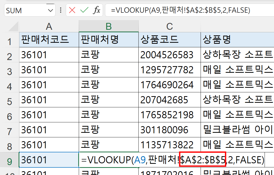 판매처!A2:B5 처럼 행과 열로 된 범위를 사용하고 싶을 때는 $(달러)를 넣어 고정시켜줘야 한다.