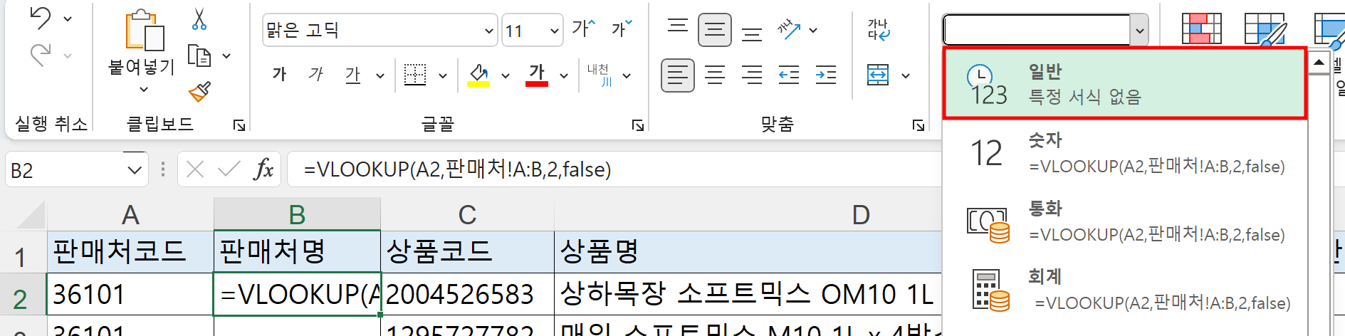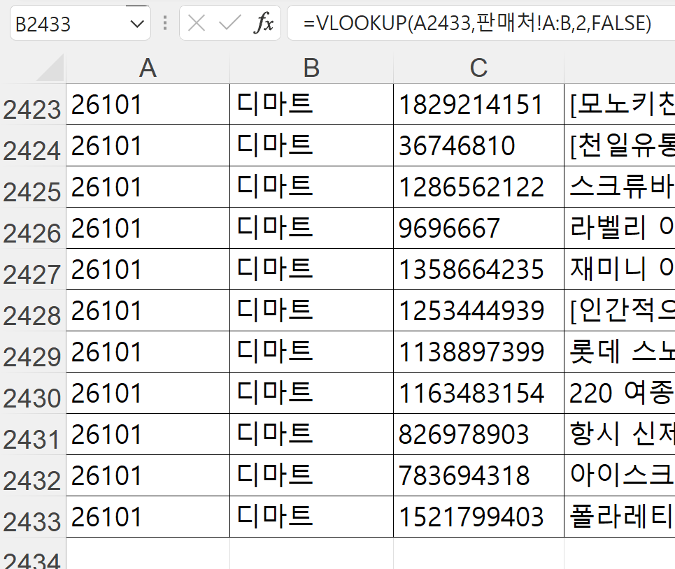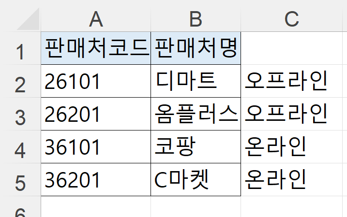 그 판매처 시트에서 A에서 B열에서 찾을 거고,