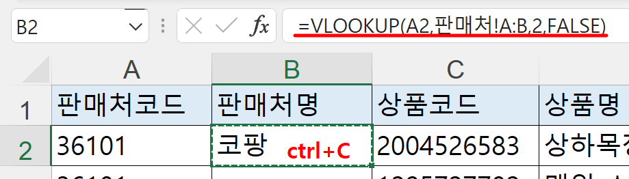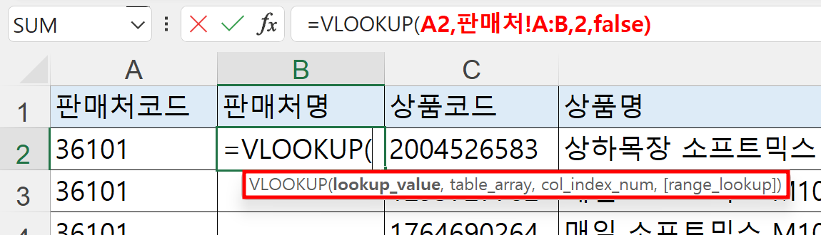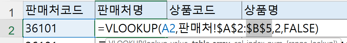 찾을 값인 lookup_value는 36101이라는 판매처코드이므로 A2,