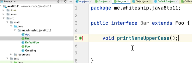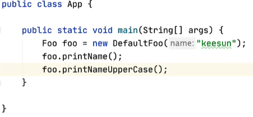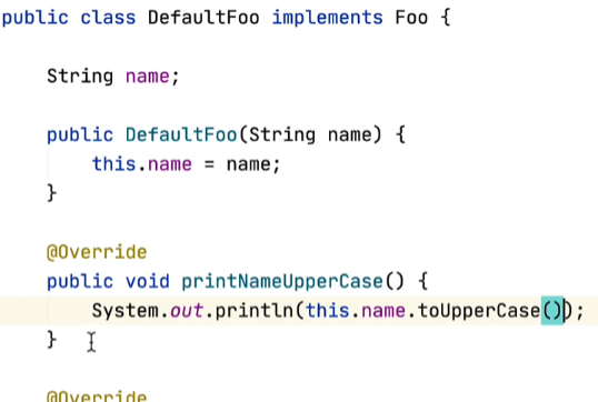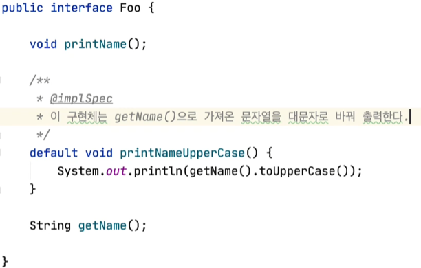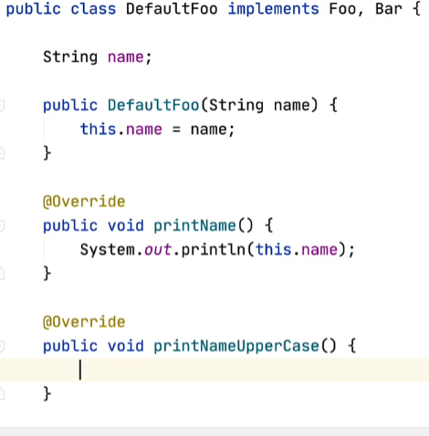 추상 메서드로 선언했는데 Bar를 구현하는 모든 인스턴스들이 printNameUpperCase를 쓰고 싶으면 다시 재정의 해줘야 한다.