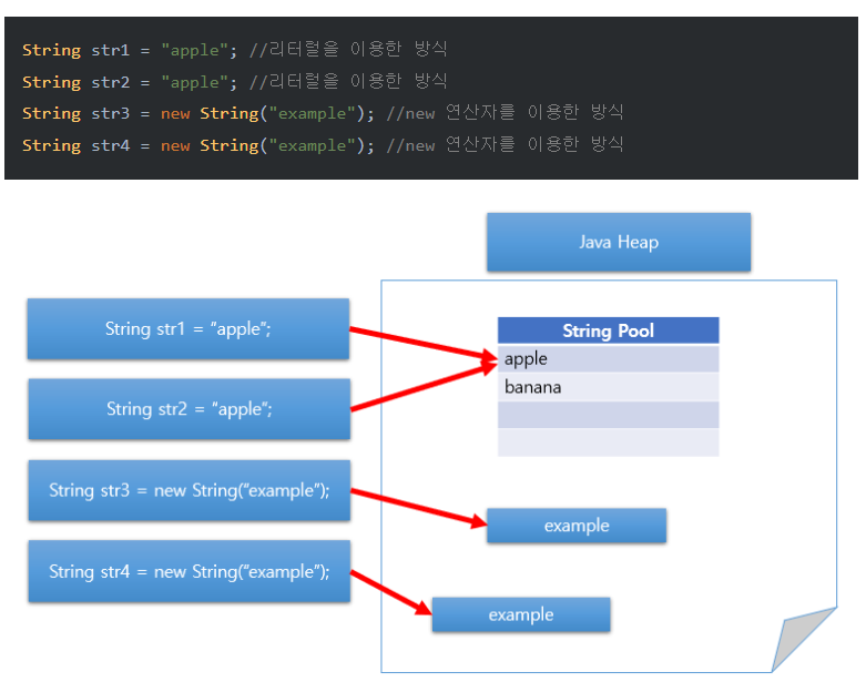 문자열은 String 객체로 생성되고 변수는 String 객체를 참조한다.