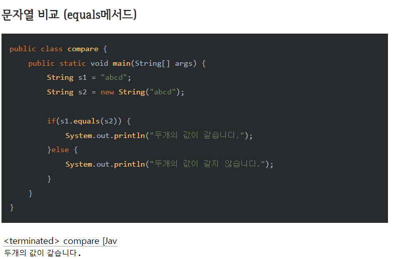 그렇기 때문에 자바에서 문자열을 비교하려면 equals 메서드를 사용해야 한다.