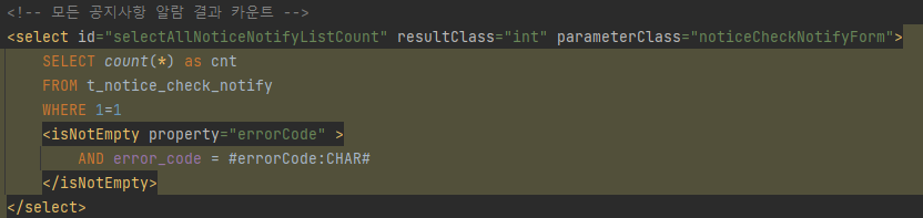 그래서 errorCode 프로퍼티로 다시 지정해주고 parameterClass를 errorCode 만들어놓은 클래스로 변경해주었더니 에러 없이 잘 돌아간다. (물론 클래스 이름은 상단에 typeAlias로 만들어주었음.)