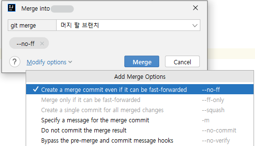 머지할 때 다양한 옵션 설정이 가능하다.