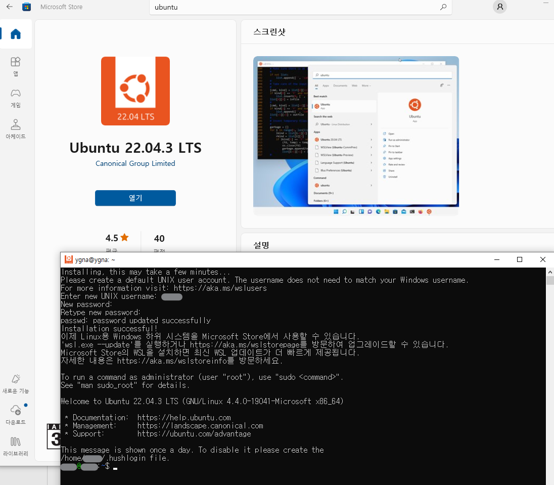 Ubuntu 다시 열면 정상 실행되고, 이름과 비밀번호를 입력해야 한다.