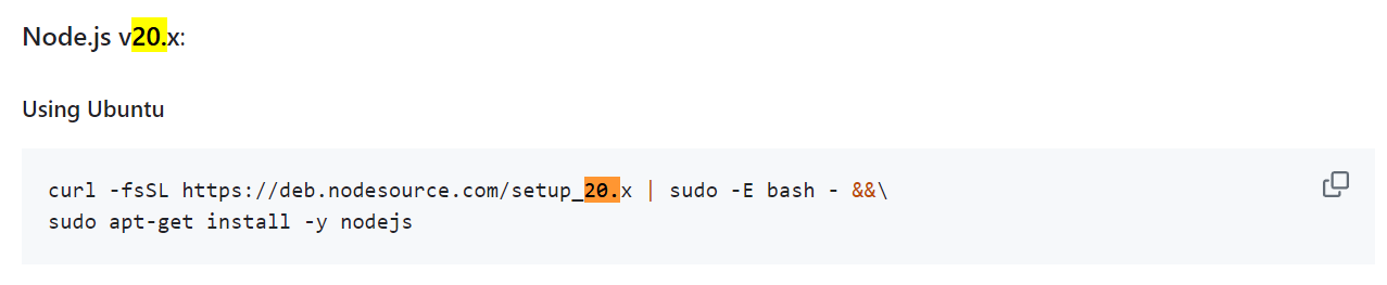 $ curl -fsSL https://deb.nodesource.com/setup_20.x | sudo -E bash - &&\