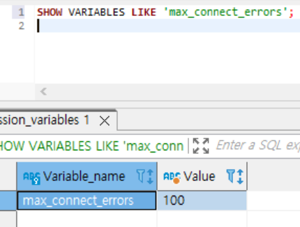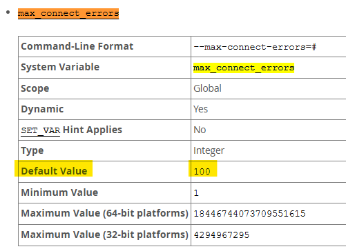 - MySQL 공식 문서에서 기본값 확인 가능 https://dev.mysql.com/doc/refman/8.0/en/server-system-variables.html#sysvar_max_connect_errors