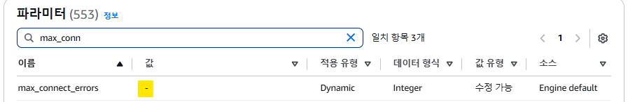 - RDS 데이터베이스 선택 > 구성 > 파라미터 그룹 선택 > 'max_connect_errors'
