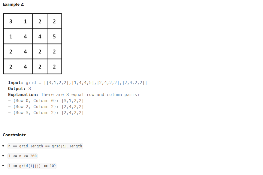주어진 n x n 크기의 정수 행렬 그리드에서 행 ri와 열 cj가 동일한 요소를 가지는 쌍 (ri, cj)의 개수를 구하라.