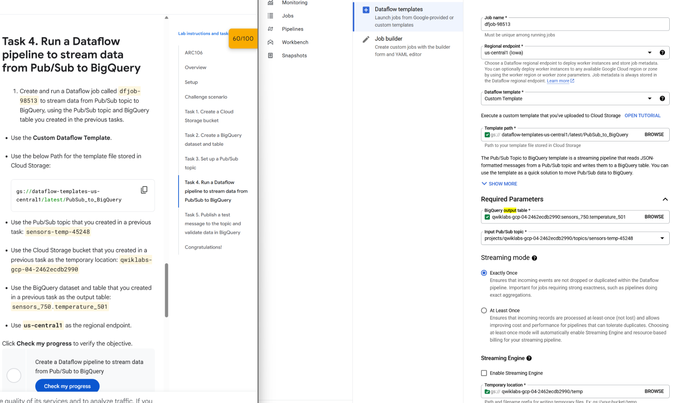 - 이후 Task 5에서 발행한 Pub/Sub 메시지를 temporary location에 저장을 못 하는지 BigQuery로 적재되지 않았다.