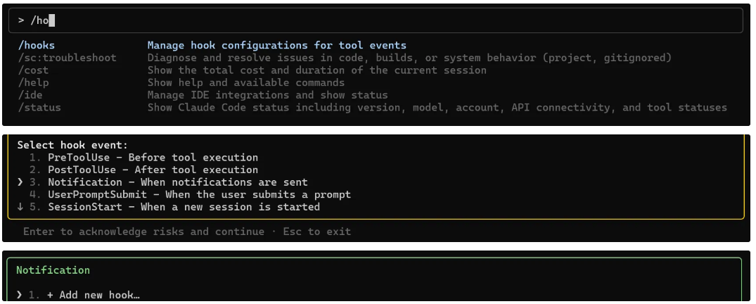 - /hooks > Notification 또는 Stop > + Add new hook...