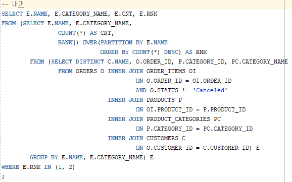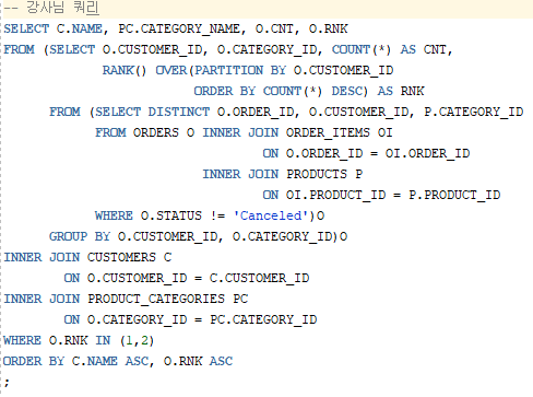 FROM (SELECT O.CUSTOMER_ID, O.CATEGORY_ID, COUNT(*) AS CNT,