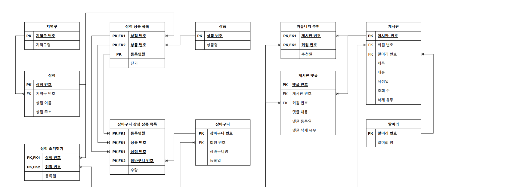 - 품목의 단가는 계속 변경되기 때문에 따로 테이블 만들어서 관리함. 그 테이블의 프라이머리 키가 3개고 그걸 가져다 써야 하므로 장바구니 상점 상품 목록 테이블은 프라이머리 키가 4개가 됨. 근데 가져온 것들은 어디꺼인지 명확해야 하기 때문에 같은 데에서 왔으니 3개 동일하게 PK, FK1이어야 함. 숫자로 구분.