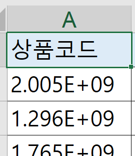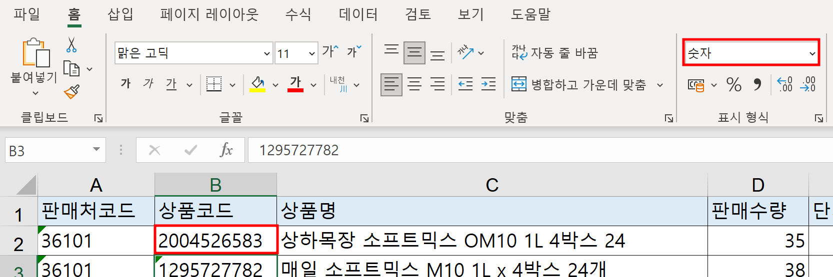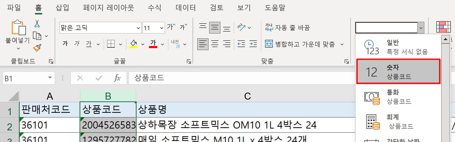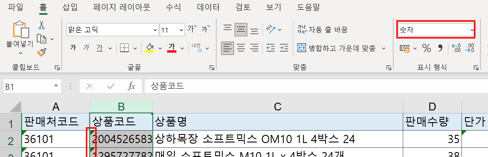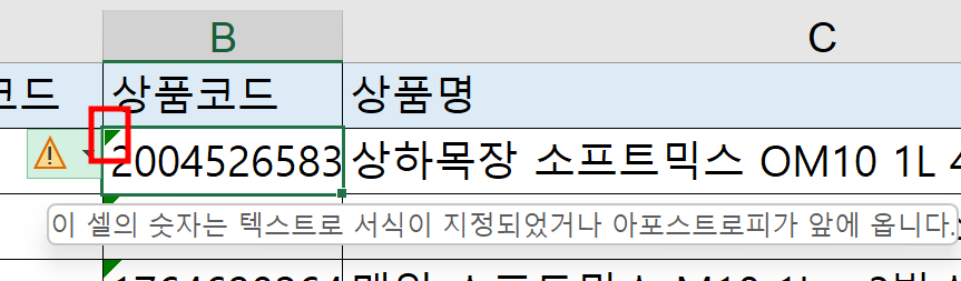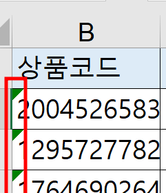이럴 때는B2셀(상품 코드)에서 F2 누르고 셀 편집으로 진입한 다음 엔터 누르면 숫자 서식으로 바뀌고 녹색 딱지가 사라진다.