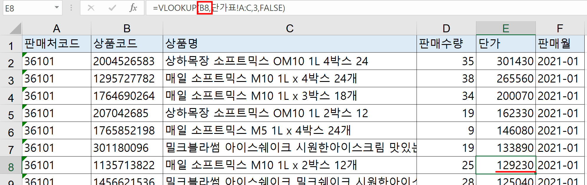 단가 셀을 보면 수식이 나머지는 그대로 있고 lookup_value만 바뀌어서 들어가 있다.