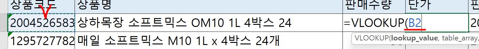 상품 코드를 클릭하면 B2가 자동으로 입력된다. lookup_value가 B2이다.