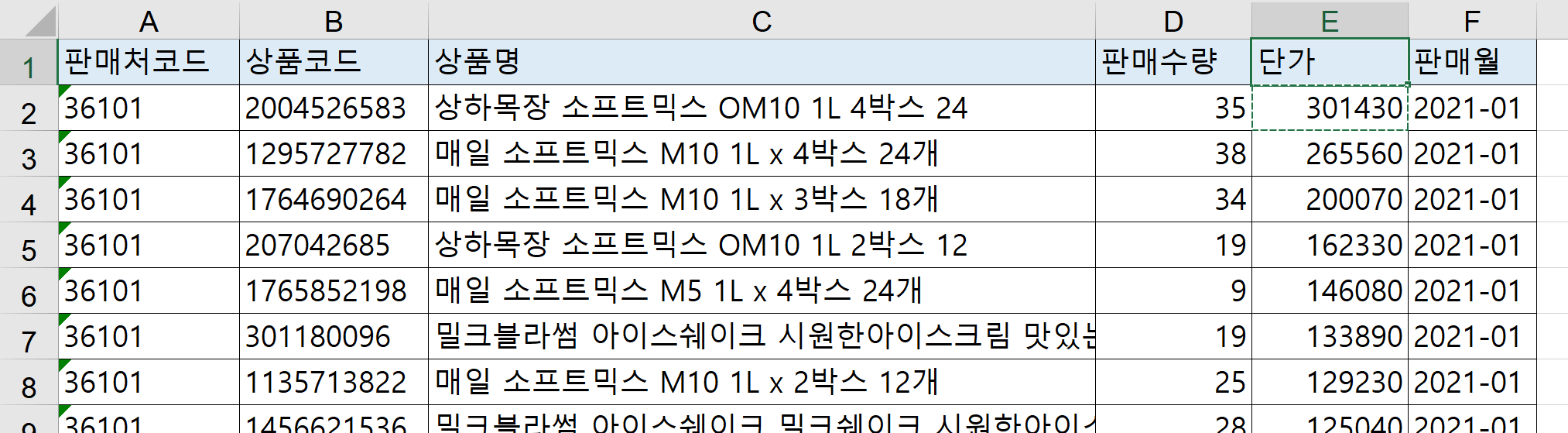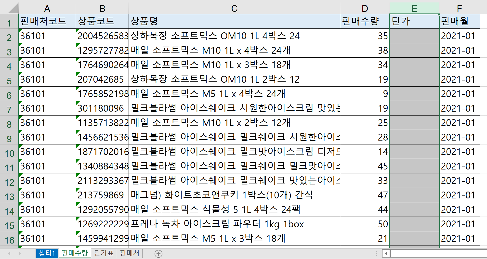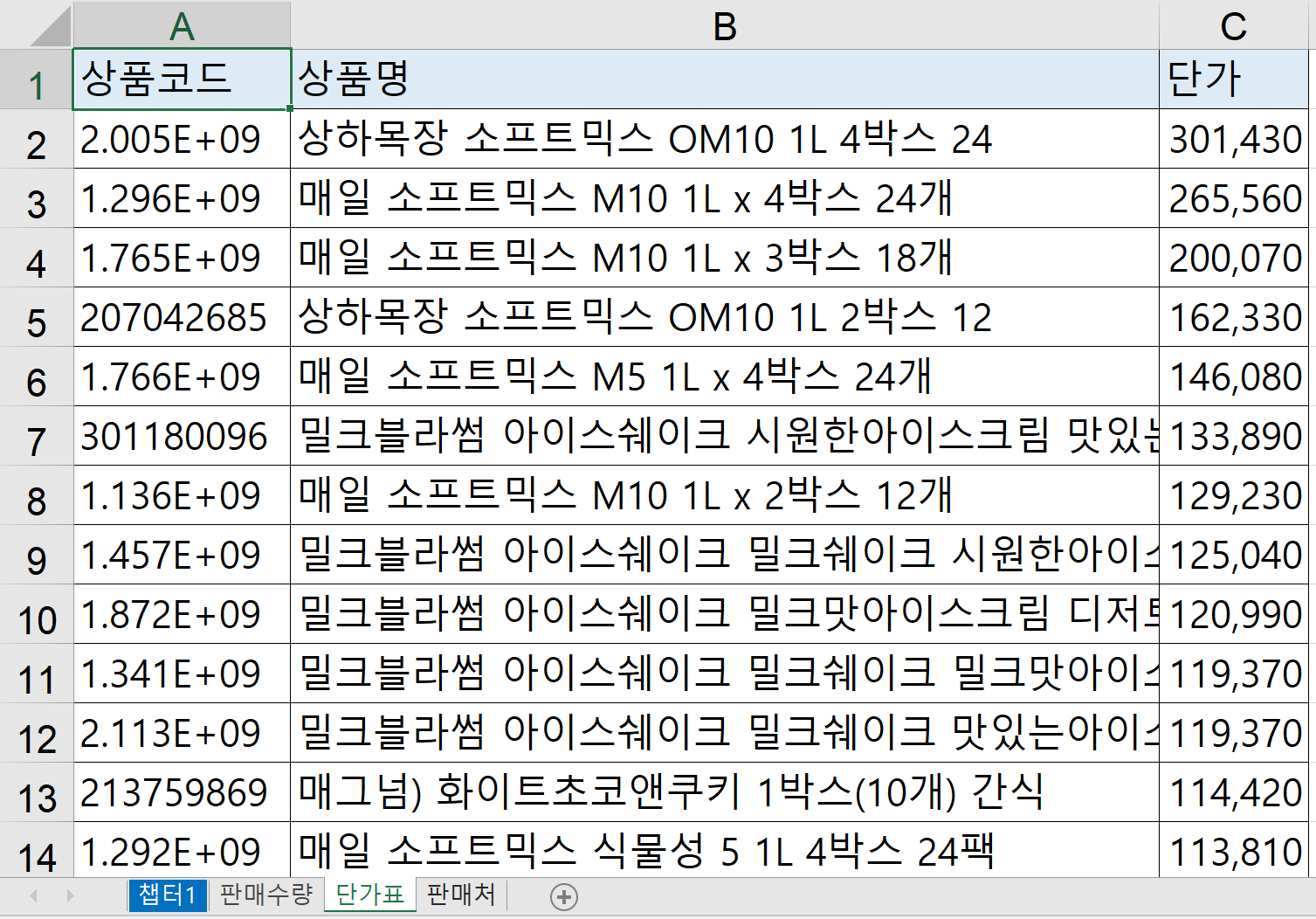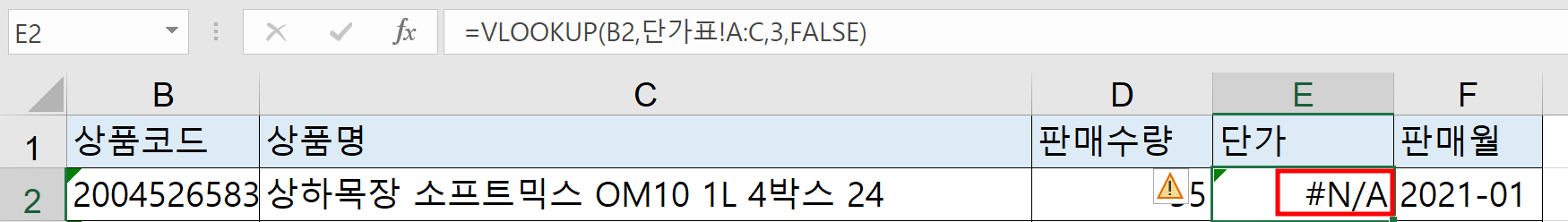그 이유는 판매수량의 상품코드는 텍스트인데 단가표의 상품코드는 숫자로 형식이 다르기 때문.