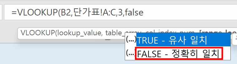 false를 쓰면 정확히 일치하는 값을 찾는다. false 대신 0으로 쓸 수도 있다.