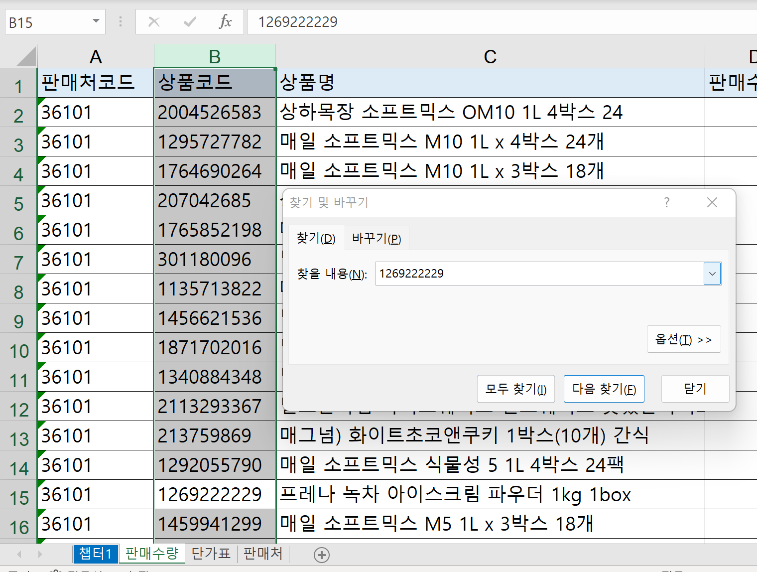 단가표 테이블에서 프레나 어쩌구의 상품코드를 복사한 다음,