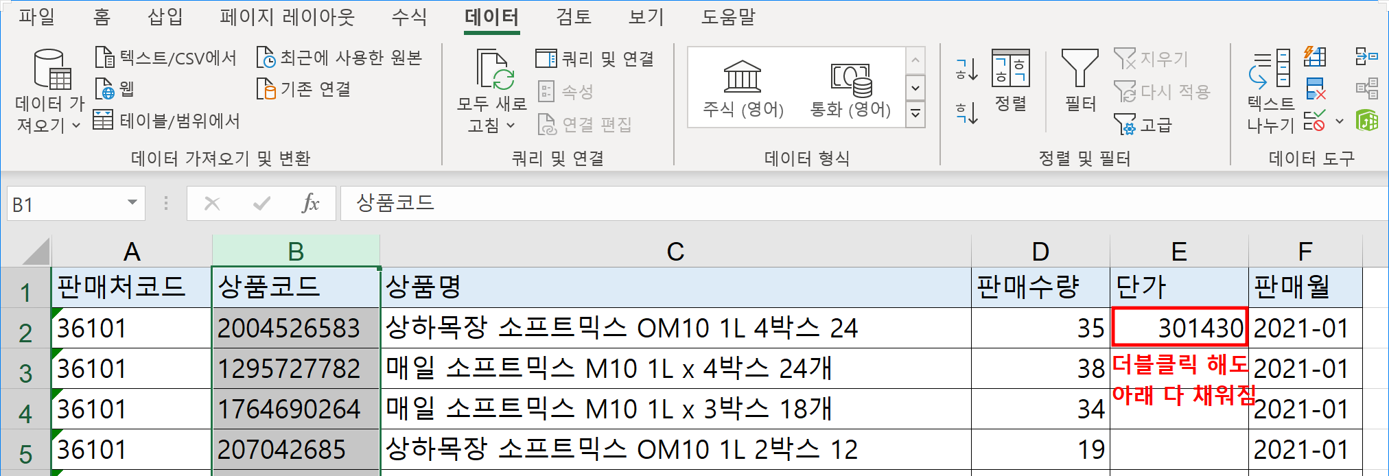 방법1처럼 더블클릭하지 않고 수식을 복사해서 채워주는 이유는 가끔 데이터 원본에서 값들이 빵꾸가 나있는 경우가 있기 때문이다. 원본에서부터 비어 있는 건 더블클릭을 눌러도 데이터가 채워지지 않는 상황이 발생한다.