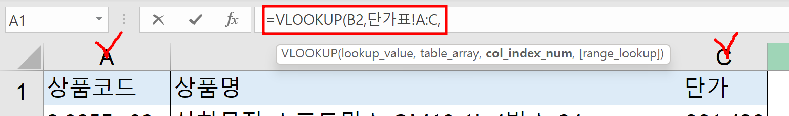 col_index는 테이블에서 상품 코드를 찾아서 그 값으로부터 오른쪽으로 세 번째에 오는 단가 값을 불러오는 거라서 col_index_num은 3이 된다.