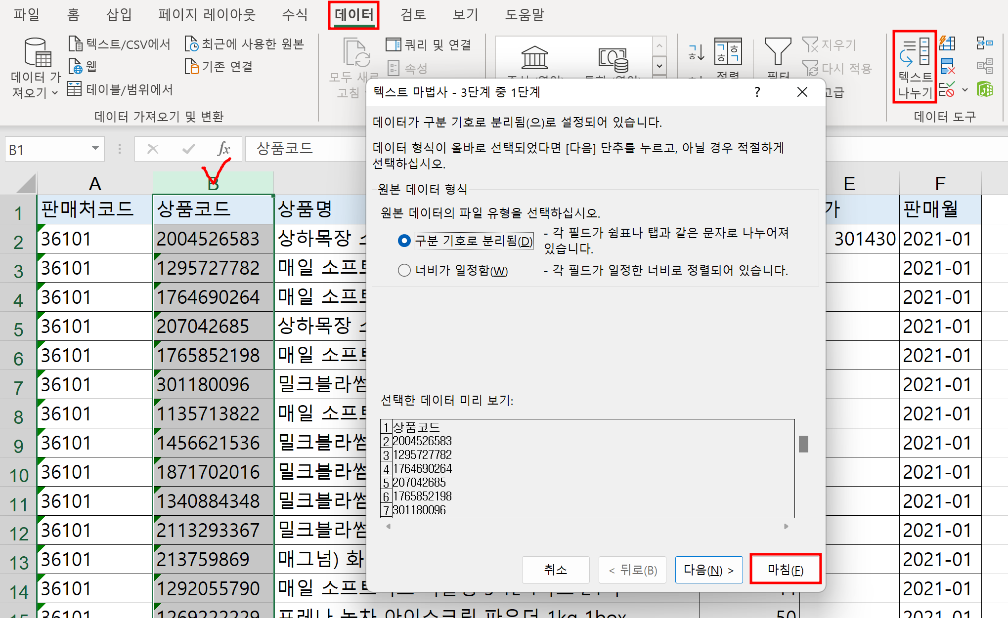 B열 전체 선택하고 데이터 - 텍스트 나누기 - 마침
