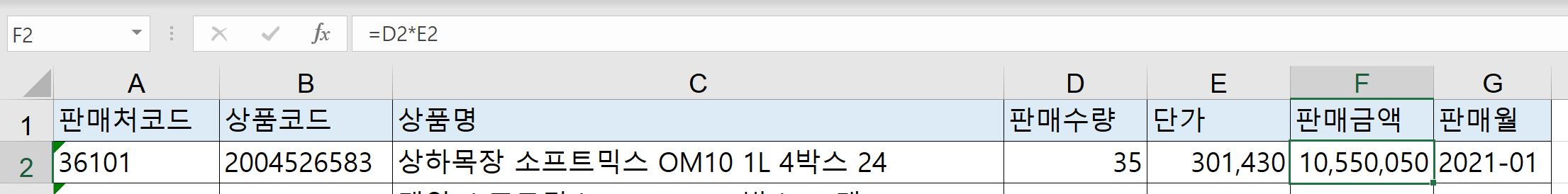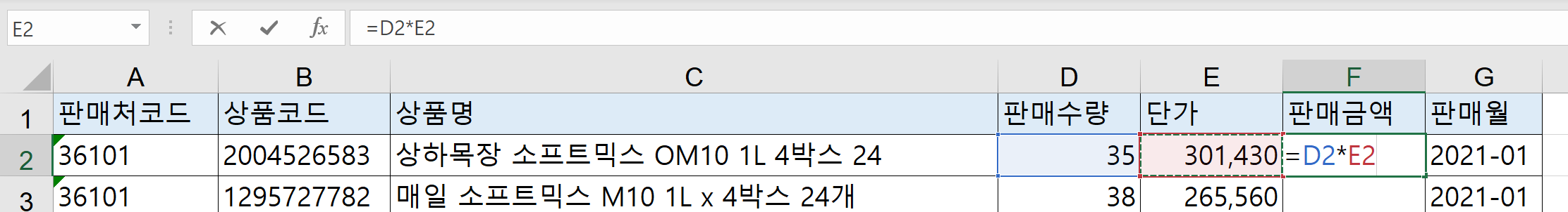 옆에 판매수량 셀(35) 클릭하고 * 입력하고 단가 셀(301,430) 클릭하면 자동으로 입력됨.