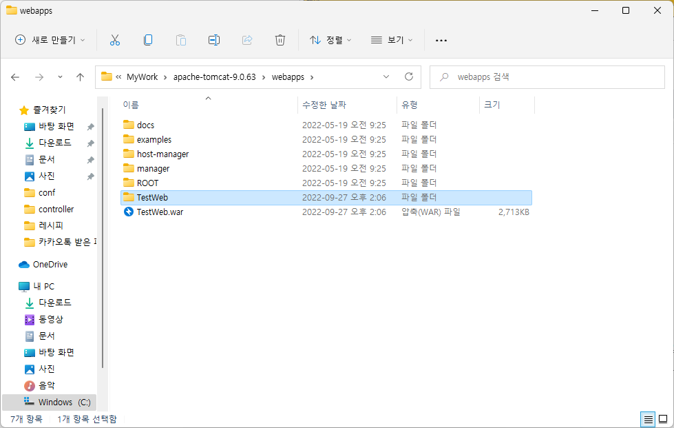 톰캣 설치된 폴더의 webapps 폴더 가면 내가 배포하려고 만든 WAR 파일을 압축 풀어서 또 가지고 있음??