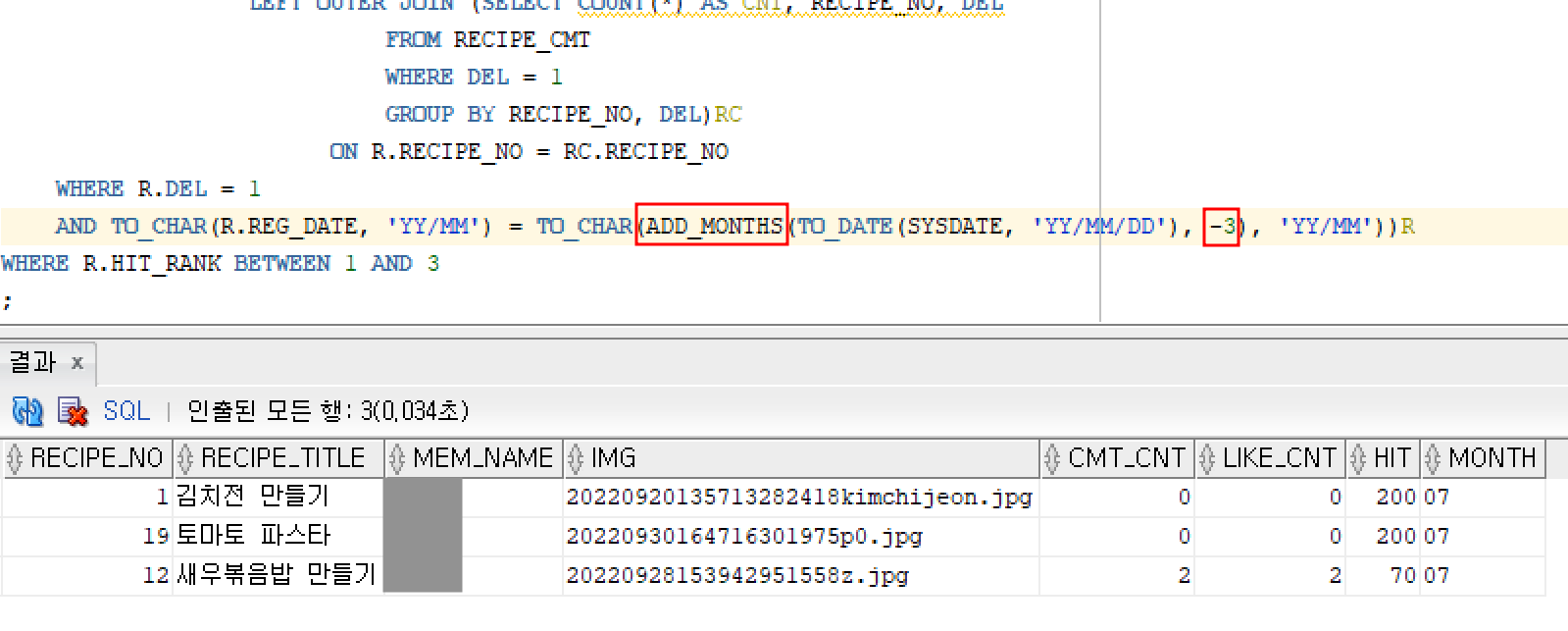 그래서 아래와 같이 쿼리를 짰고 ADD_MONTH의 -3 자리는 컨트롤러에서 숫자만 바꿔서 실행시켜서 달마다 뽑게 했다.