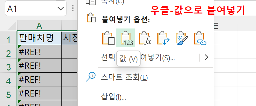 다시 우클 누르고 123 써진 값으로 붙여넣기 클릭하면 정상적으로 붙여넣기가 된다.