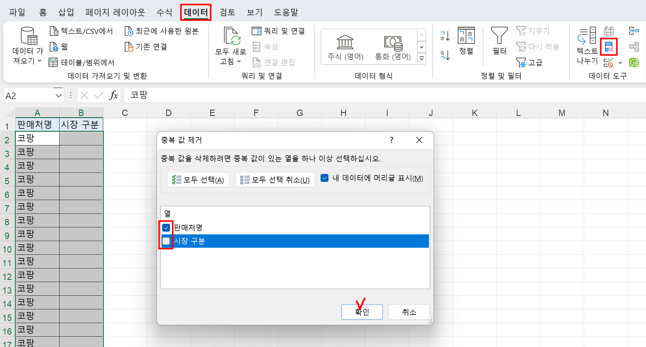 시장 구분은 체크 풀고 확인 누르면 중복 제거된 깔끔한 테이블 완성!