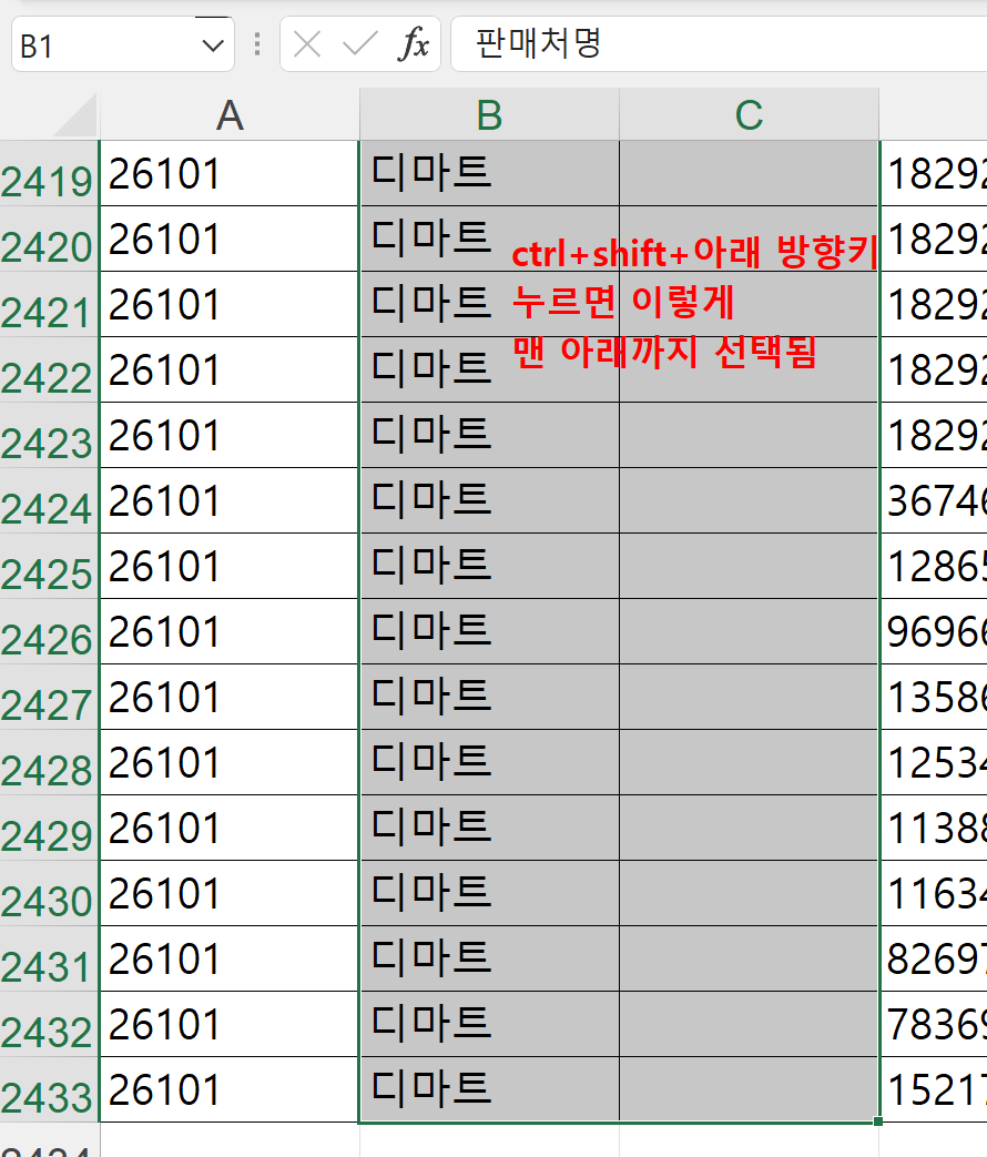 ctrl + shift + 아래 방향키를 눌러 데이터 전체를 선택해준다.