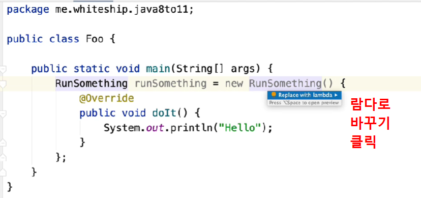 함수형 인터페이스라는 소리는 람다로 바꿀 수도 있다는 소리니 저렇게 간단하게 줄일 수가 있고,