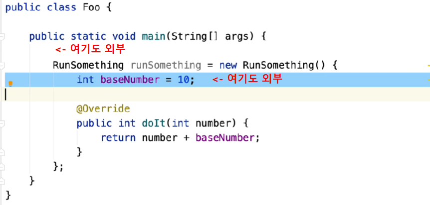 // IntConsumer printInt = (baseNumber) -> { // 같은 스콥이므로