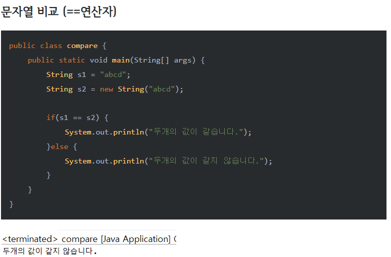 그렇기 때문에 자바에서 문자열을 비교하려면 equals 메서드를 사용해야 한다.